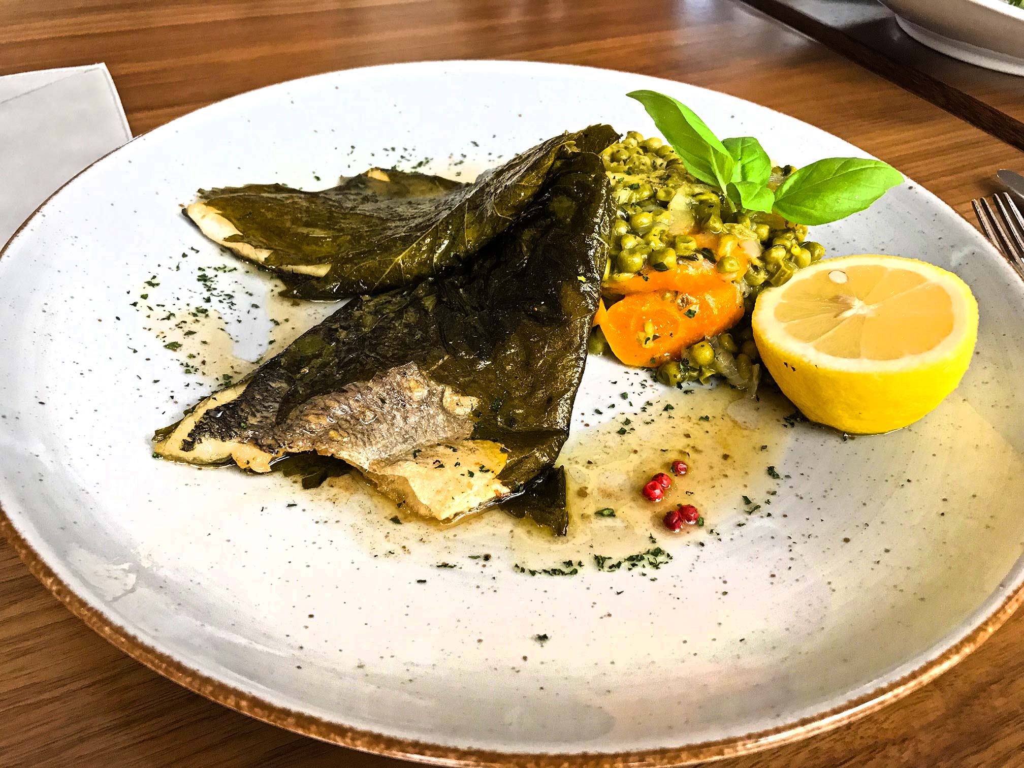 707. Doradenfilet – Weintraubenblätter/ Erbsen/ Karotten/ Kartoffeln