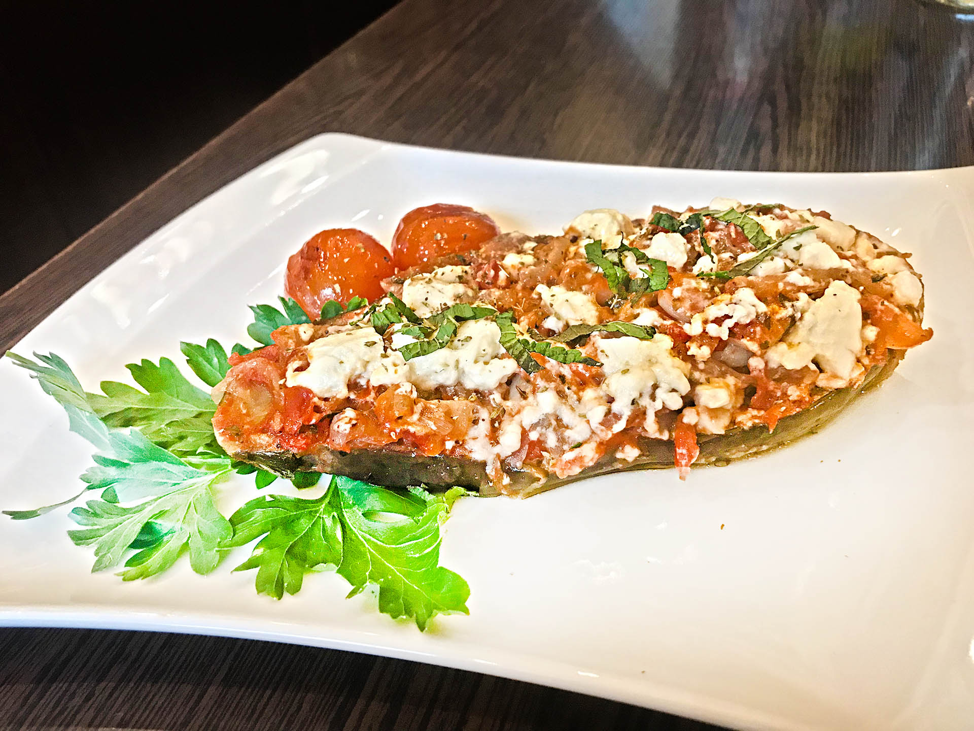 703. Sommer Auberginen – Auberginen/ Zwiebeln/ Tomatensauce/ Feta/ Kräuter