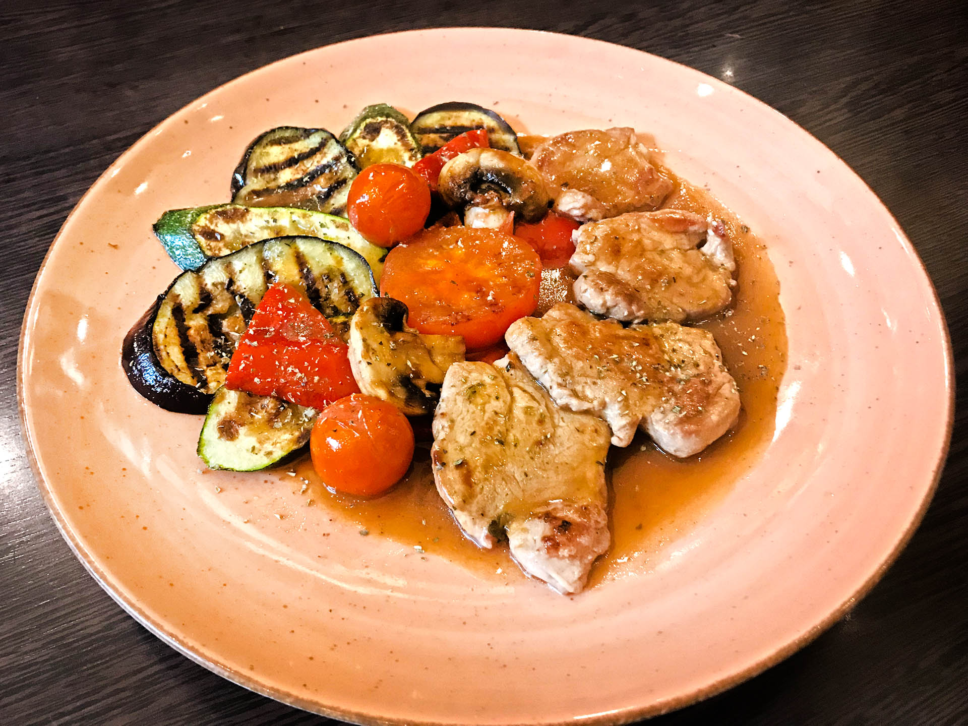 706. Schweinefilet Medaillons – Schweinefilet/ Auberginen/ Paprika/ Tomaten/ Zucchini/ Pilze /Thymiansauce ♦
