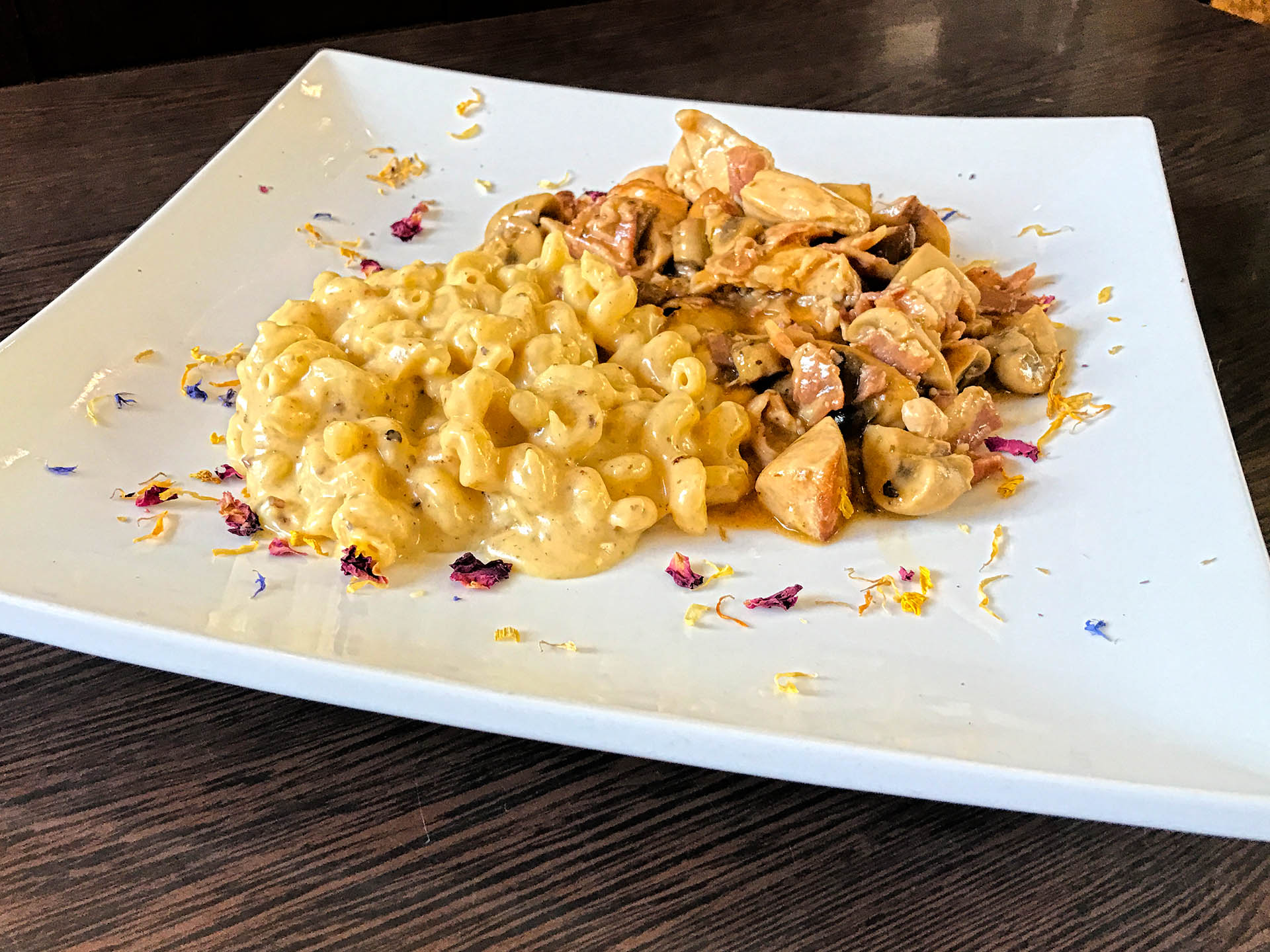 707. Hähnchen Geschnetzeltes „Tigania“– Hähnchenbrustfilet/ Bacon/ Champignons/ Paprika/ Mac ’n‘ Cheese Nudeln ♦