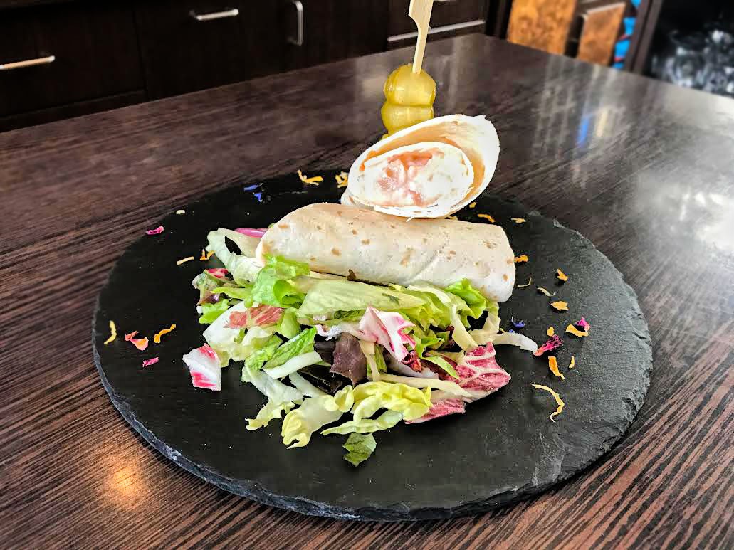 702. Tortilla mit Lachs Mousse – Lachs/ Scampi/ grüne Salat/ Gürkenpickle