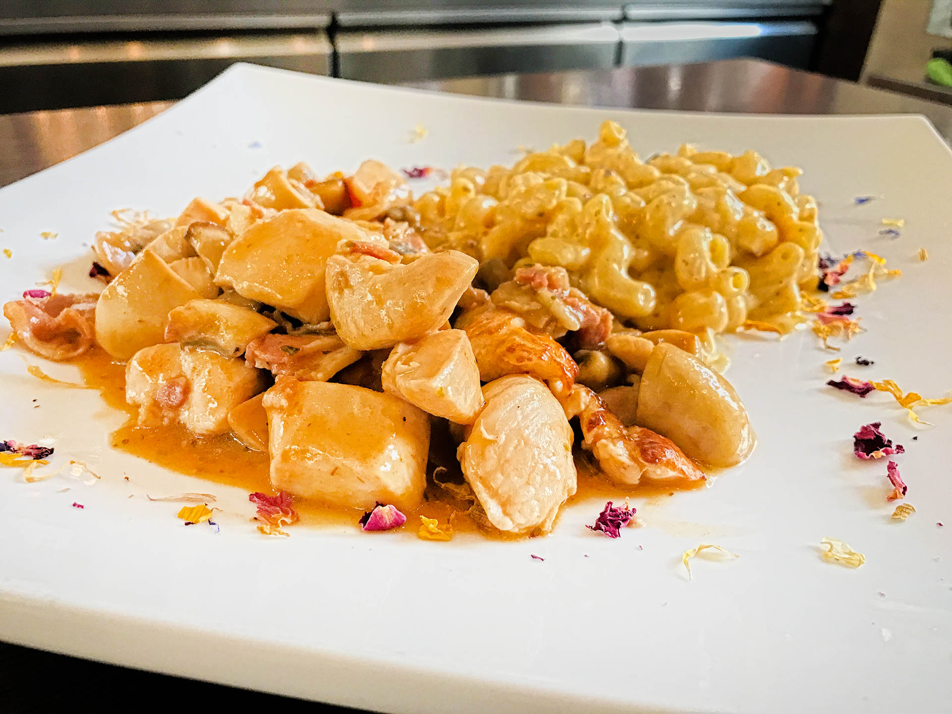 707. Hähnchen Geschnetzeltes „Tigania“– Hähnchenbrustfilet/ Bacon/ Champignons/ Paprika/ Mac ’n‘ Cheese Nudeln ♦